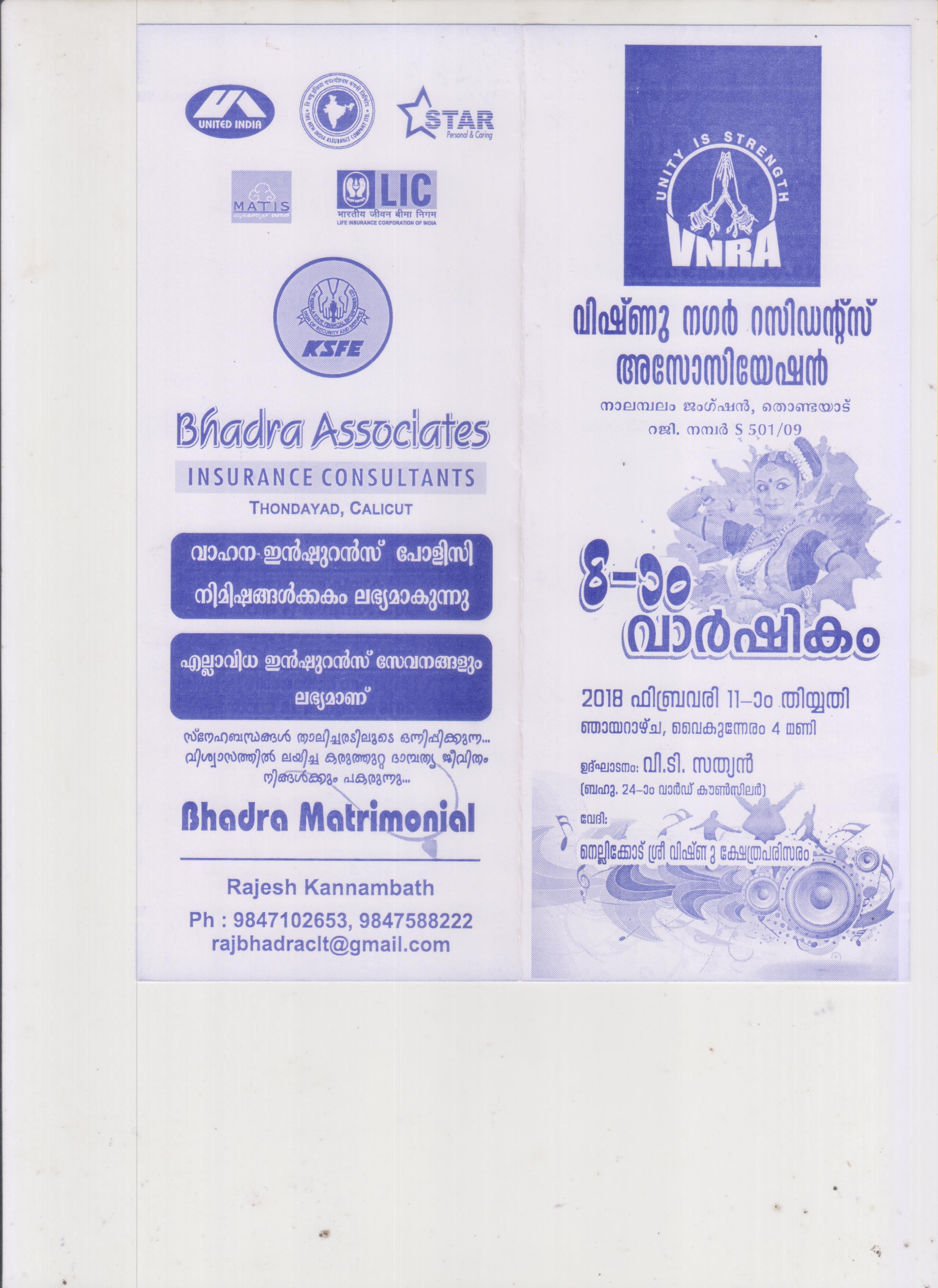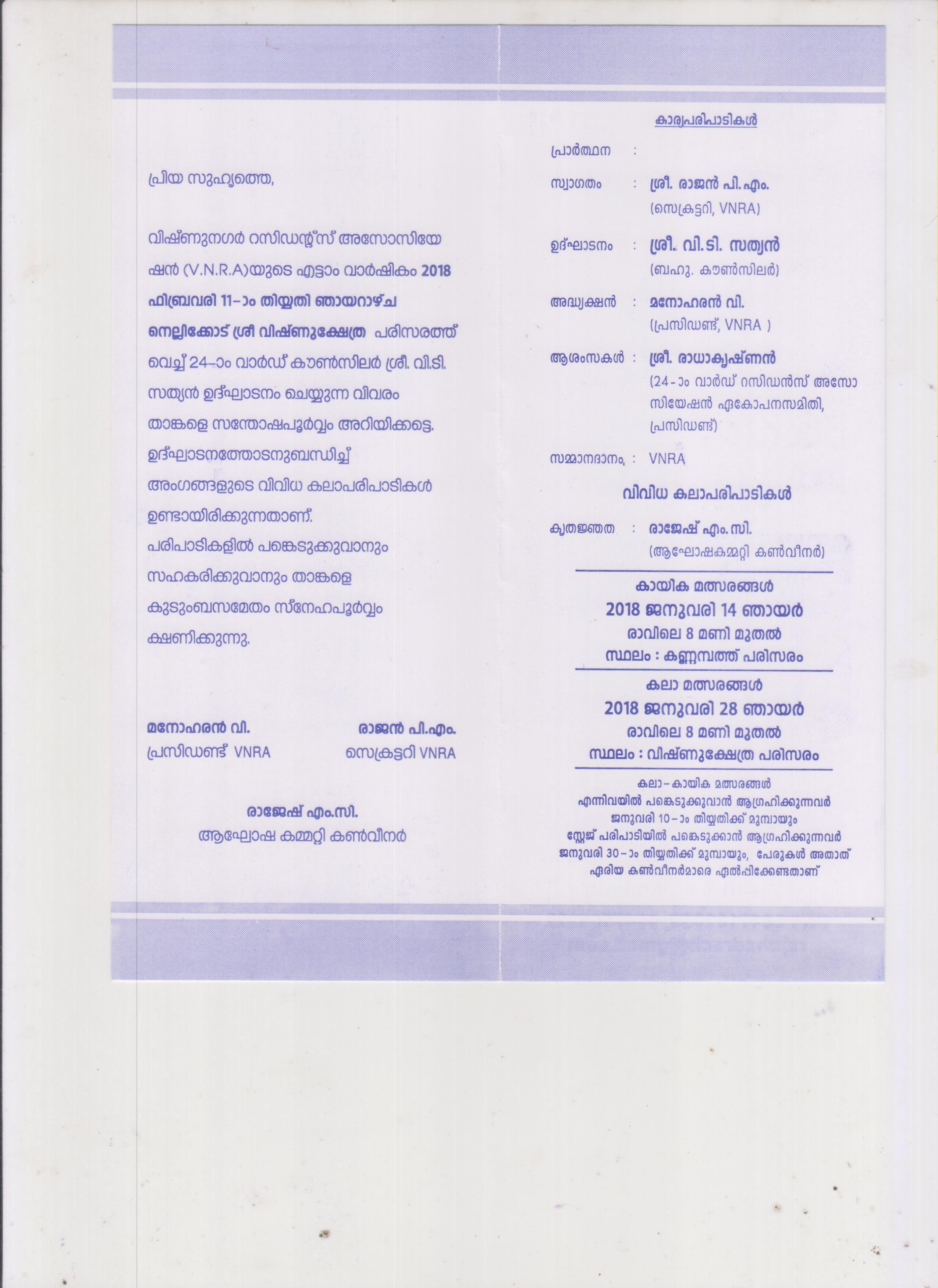 VNRA is a Residents Association of Vishnu Nagar (Reg :501/09) surroundings of Nellicode Sree VISHNU TEMPLE Nalambalam junction, Thondayad, Chevarambalam (P.O) Kozhikode - 673017 formed in 2009. Our logo is "UNITY IS STRENGTH". This is an association of 185 families resides with in the boundary of Vishnu Nagar. That is east side of bypass Nalambalam junction to Kudilthode, South side of Kudilthode substation road west side of Ullelum Meethal road and Chettyamveetil road and north side of Mavoor road Nalambalam junction to Ullelum Meethal road. Our aim is to entire development in health, wealth and culture of members and unity of entire family.